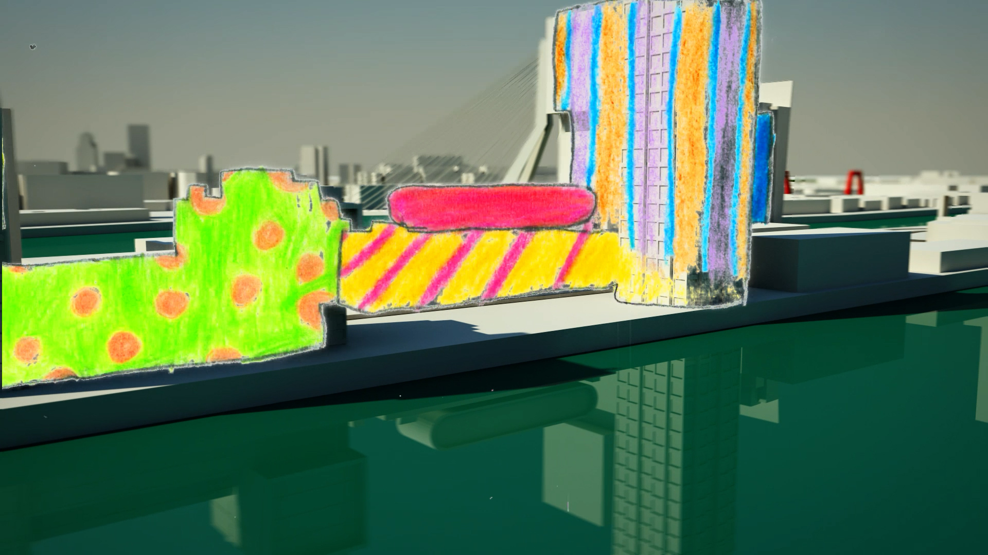 We started with the layout of the city of Rotterdam from Stage 2, where we came up with a number of interesting themes, developed the course of the animation and then printed each frame of the entire animation.